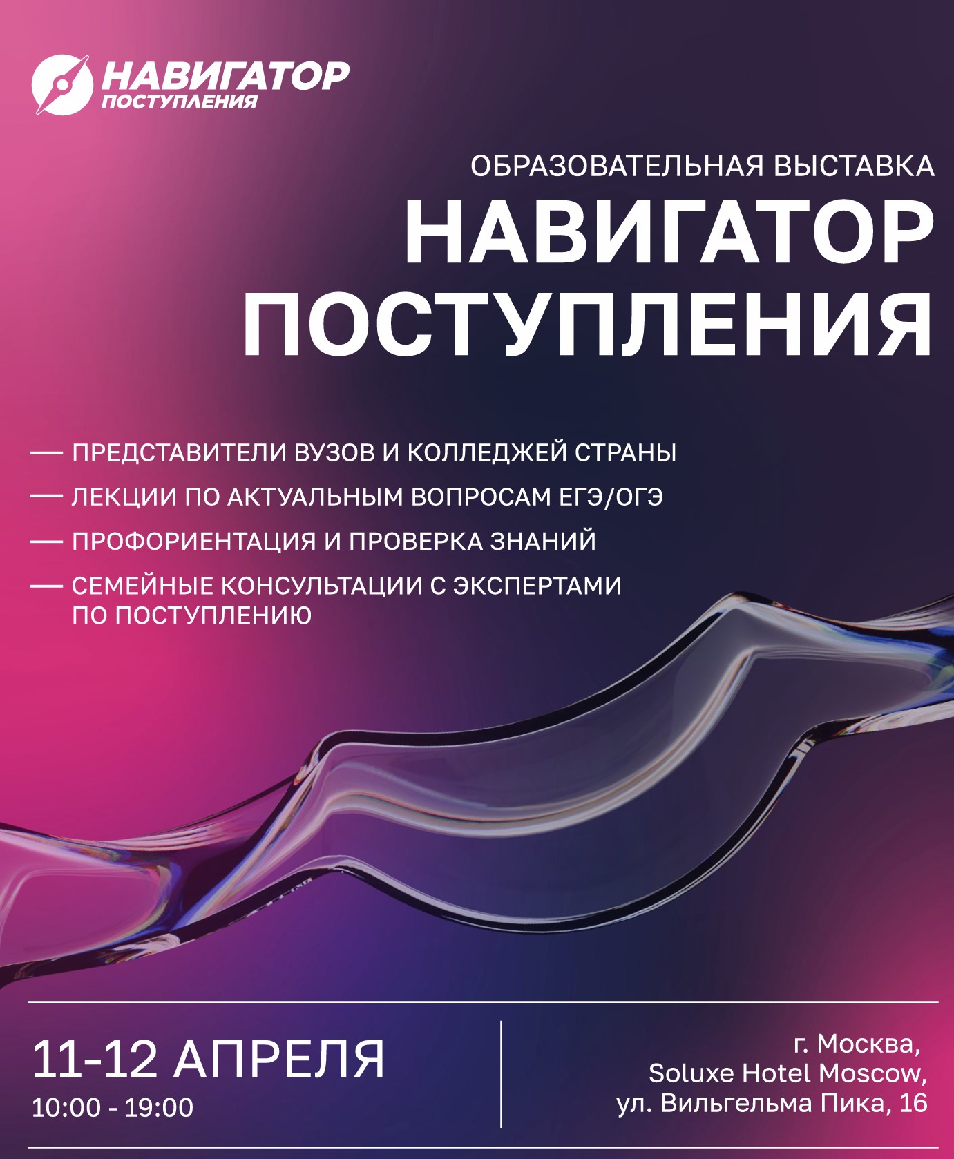 Уважаемые абитуриенты! Приглашаем вас принять участие в крупнейшей образовательной выставке "Навигатор Поступления", которая пройдет в Москве 11-12 апреля . *название вуза/колледжа* будет ждать Вас на своем стенде. Вы сможете задать любые вопросы о наших программах подготовки и правилах поступления, возможностях практики и трудоустройства, студенческой жизни и, конечно, задать любые волнующие вас вопросы!