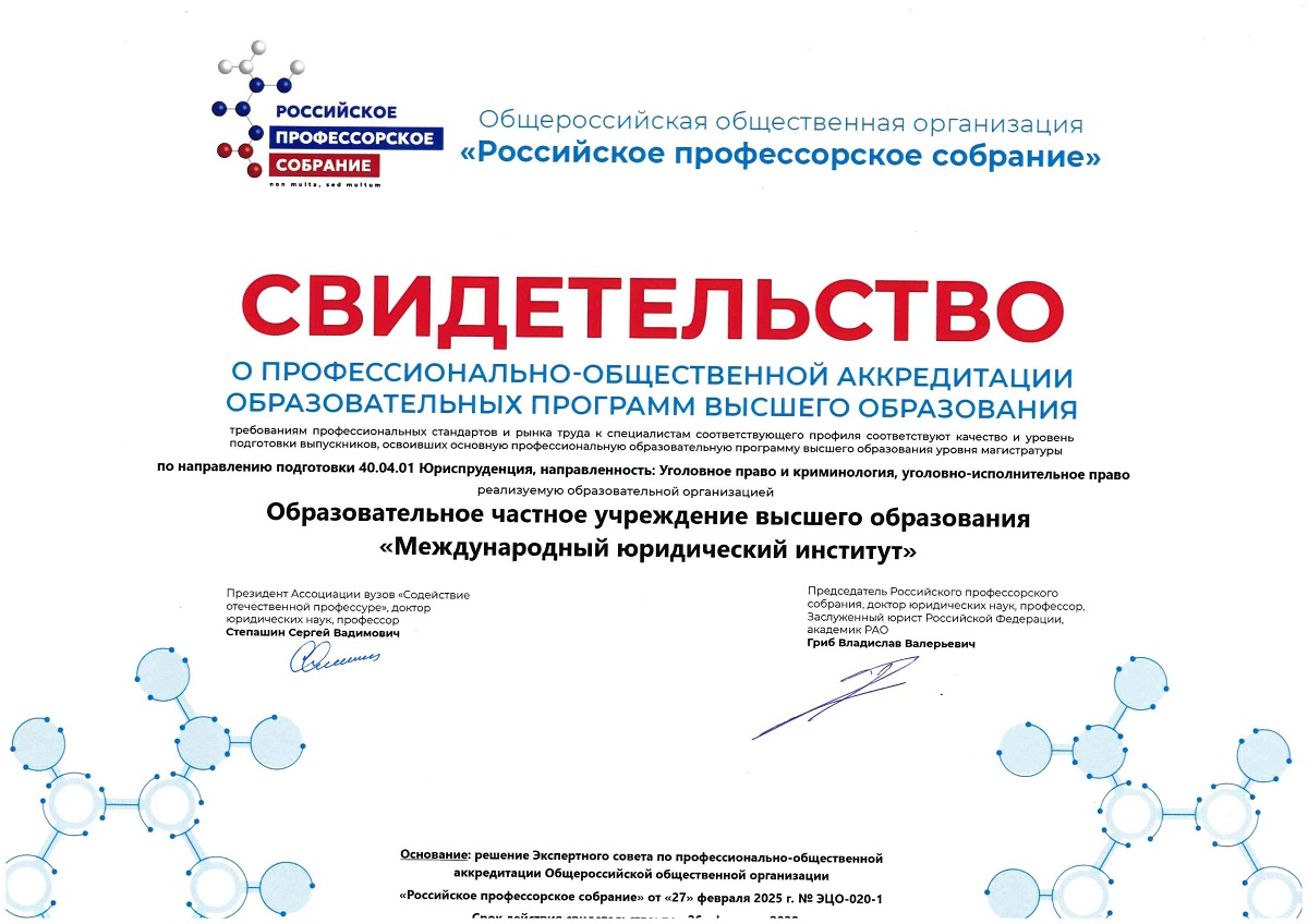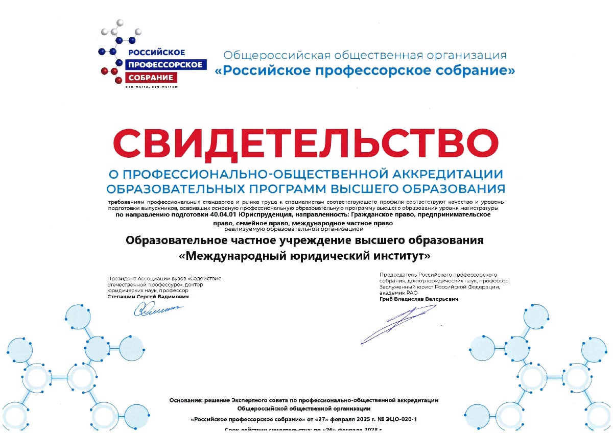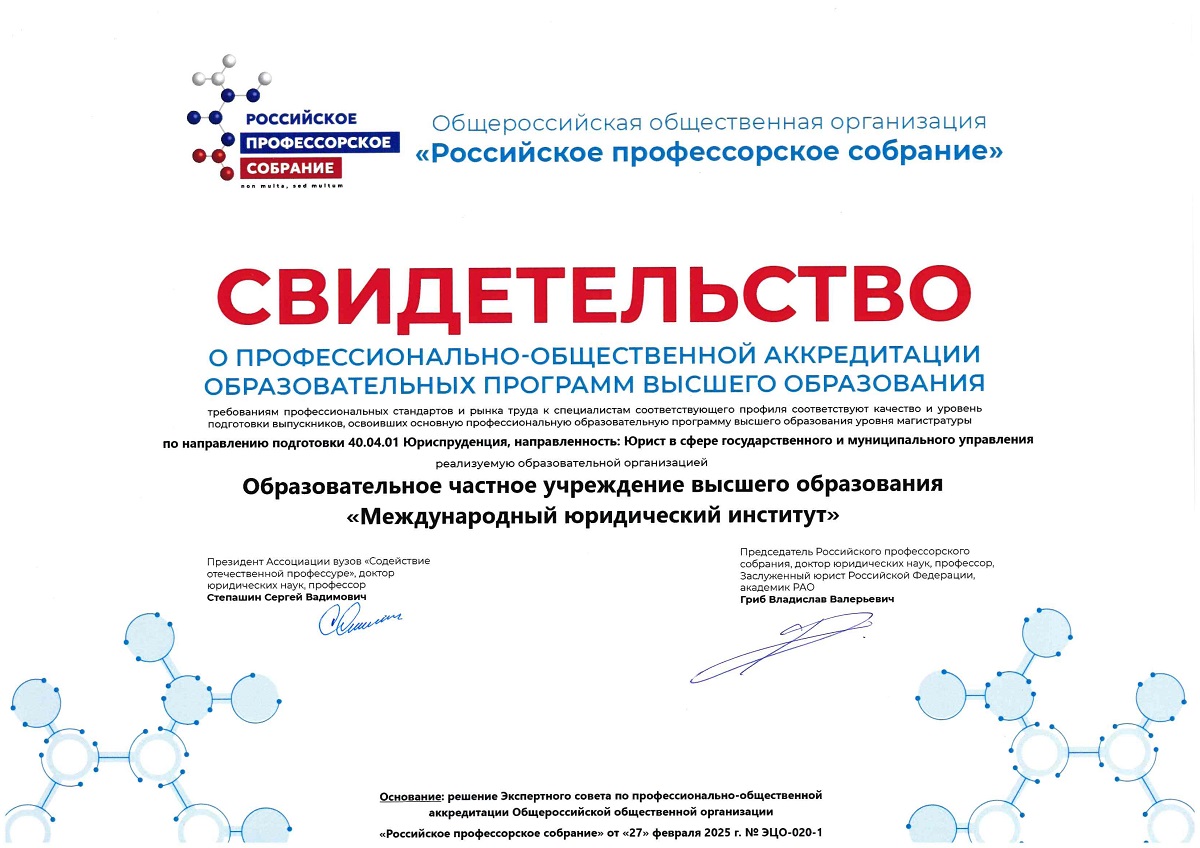 Решением Экспертного совета по профессионально-общественной аккредитации Общероссийской общественной организации «Российское профессорское собрание» от 27 февраля 2025 года № ЭЦО-020-1 все три программы были аккредитованы. Долгожданные свидетельства об общественной аккредитации были вручены представителю института в торжественной обстановке.